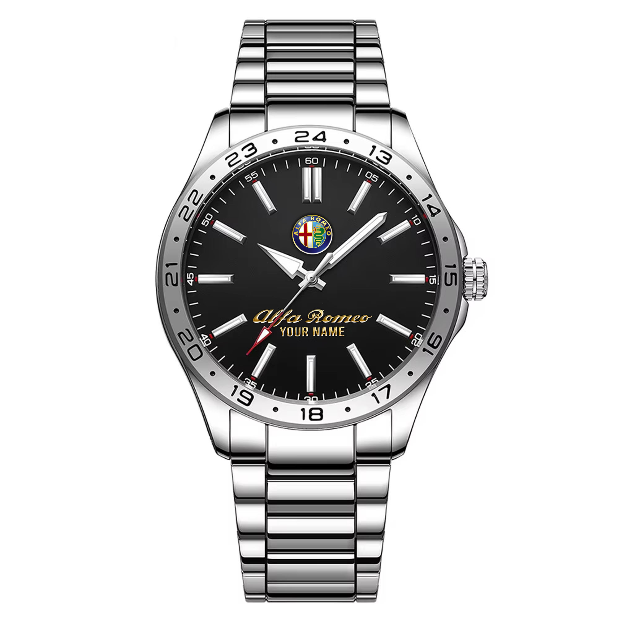 With the launch of the exclusive Made-to-Order service, you can make your watch unique by not only having your special Alfa Romeo Emblem but also your Name printed on the watch. Elevate your style with our custom watches featuring your favorite car logo. Meticulously crafted for durability and water resistance, these watches are the perfect item for daily use. Discover the ultimate combination of luxury, utility, and personalization!