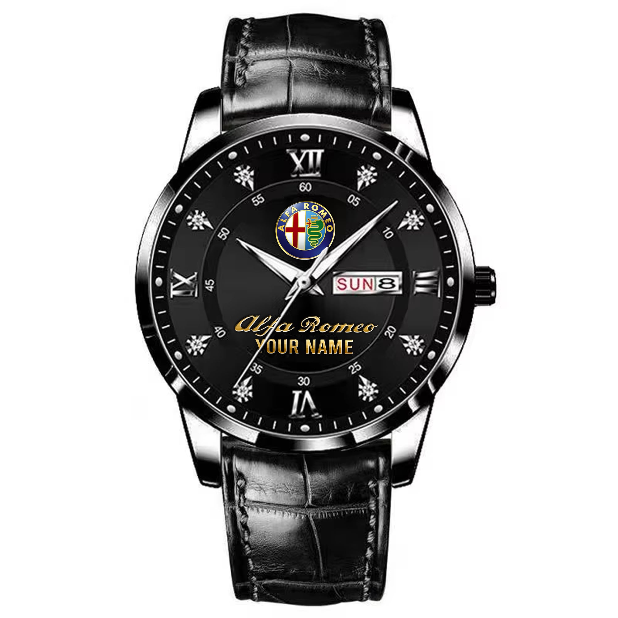 With the launch of the exclusive Made-to-Order service, you can make your watch unique by not only having your special Alfa Romeo Emblem but also your Name printed on the watch. Elevate your style with our custom watches featuring your favorite car logo. Meticulously crafted for durability and water resistance, these watches are the perfect item for daily use. Discover the ultimate combination of luxury, utility, and personalization!