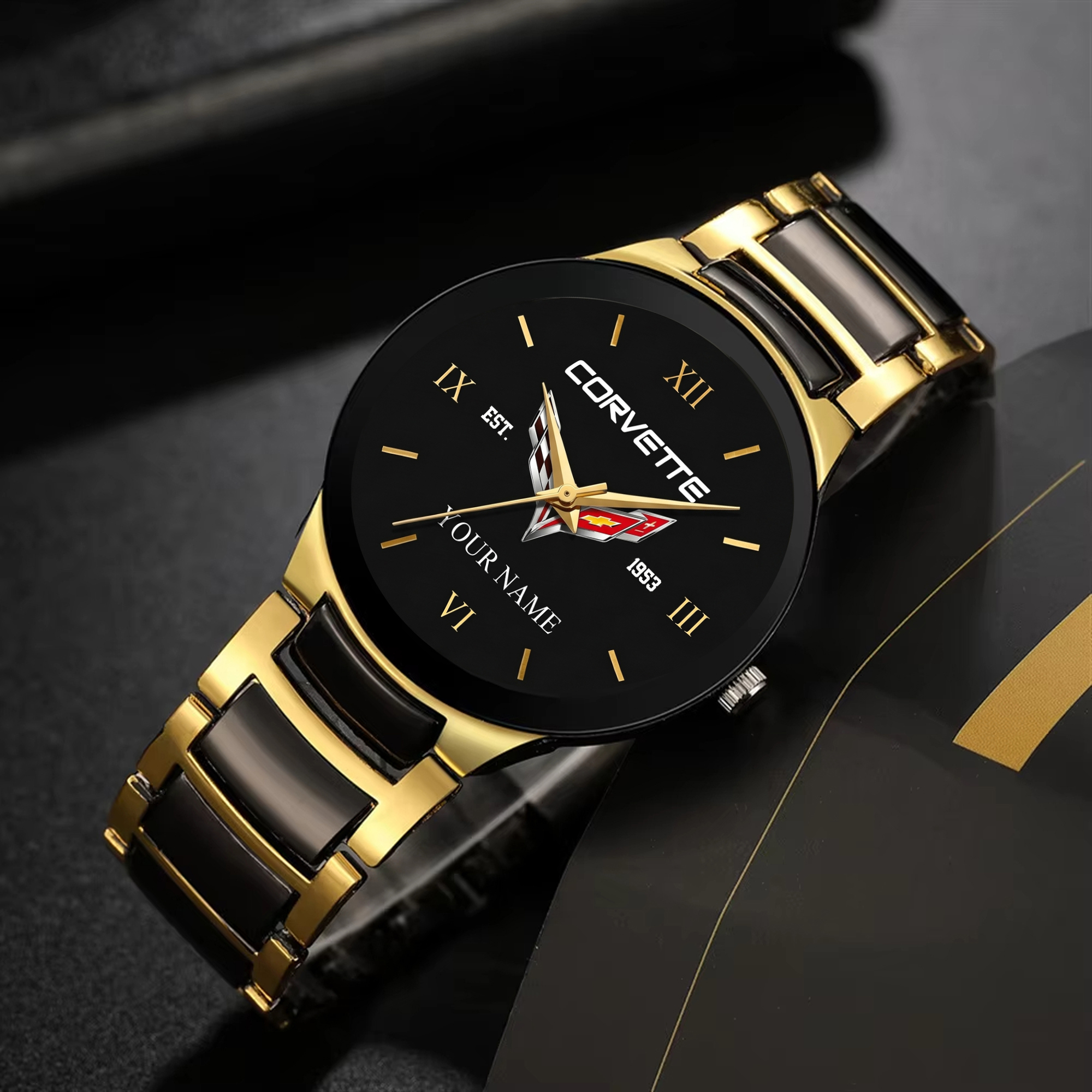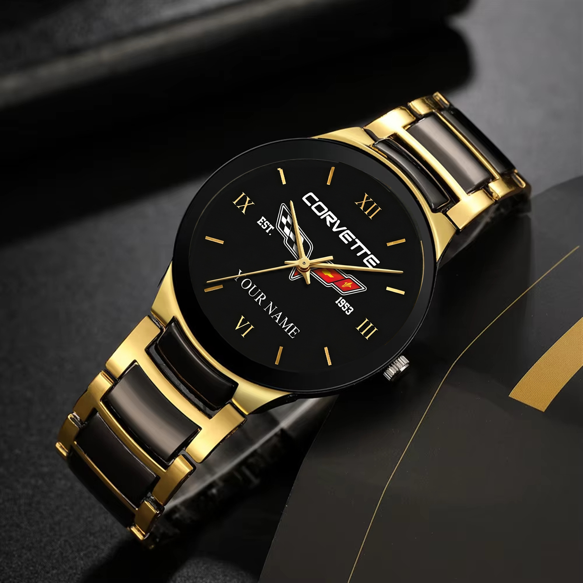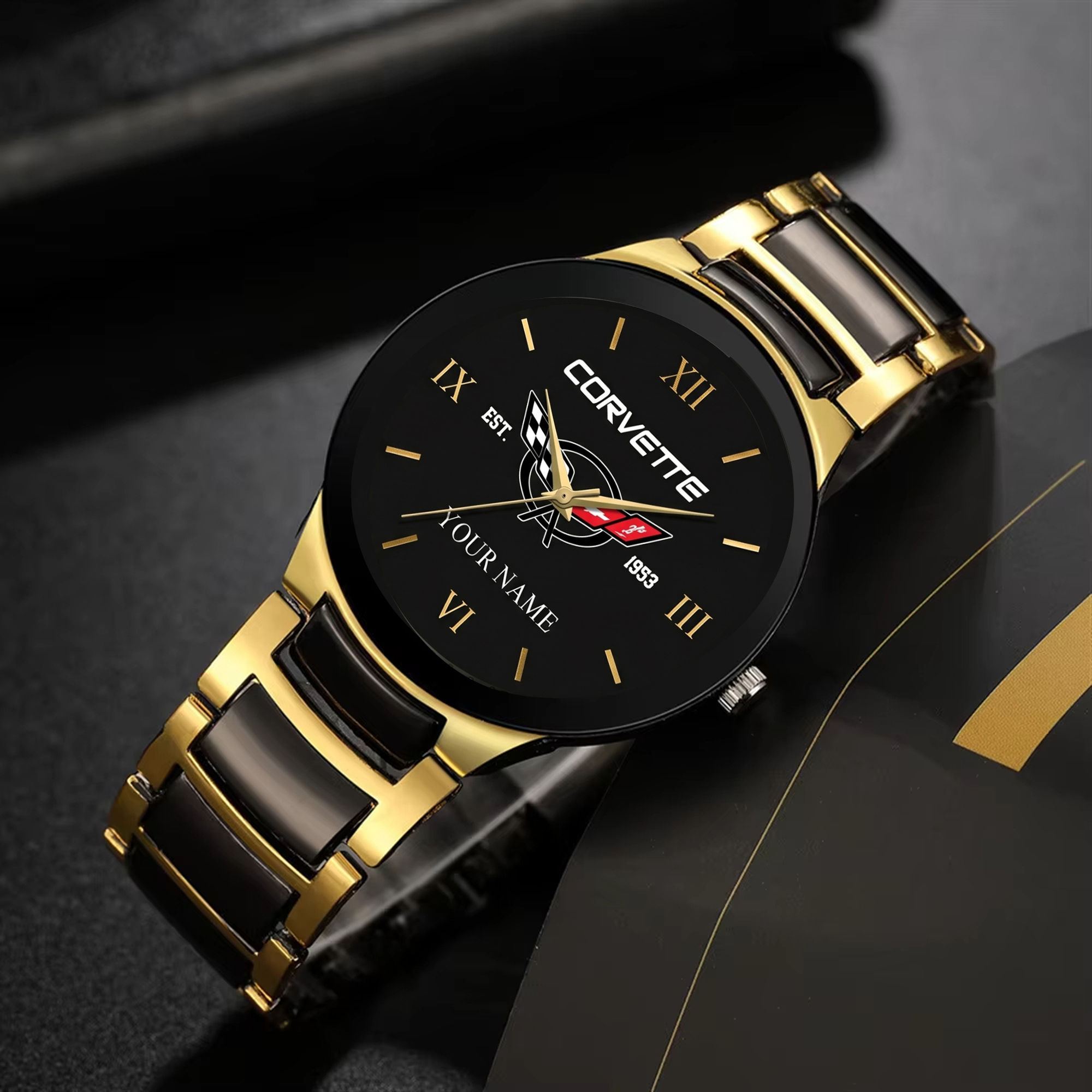 With the launch of the exclusive Made-to-Order service, you can make your watch unique by not only having your special Corvette Emblem but also your Name printed on the watch. Elevate your style with our custom watches featuring your favorite car logo. Meticulously crafted for durability and water resistance, these watches are the perfect item for daily use. Discover the ultimate combination of luxury, utility, and personalization!