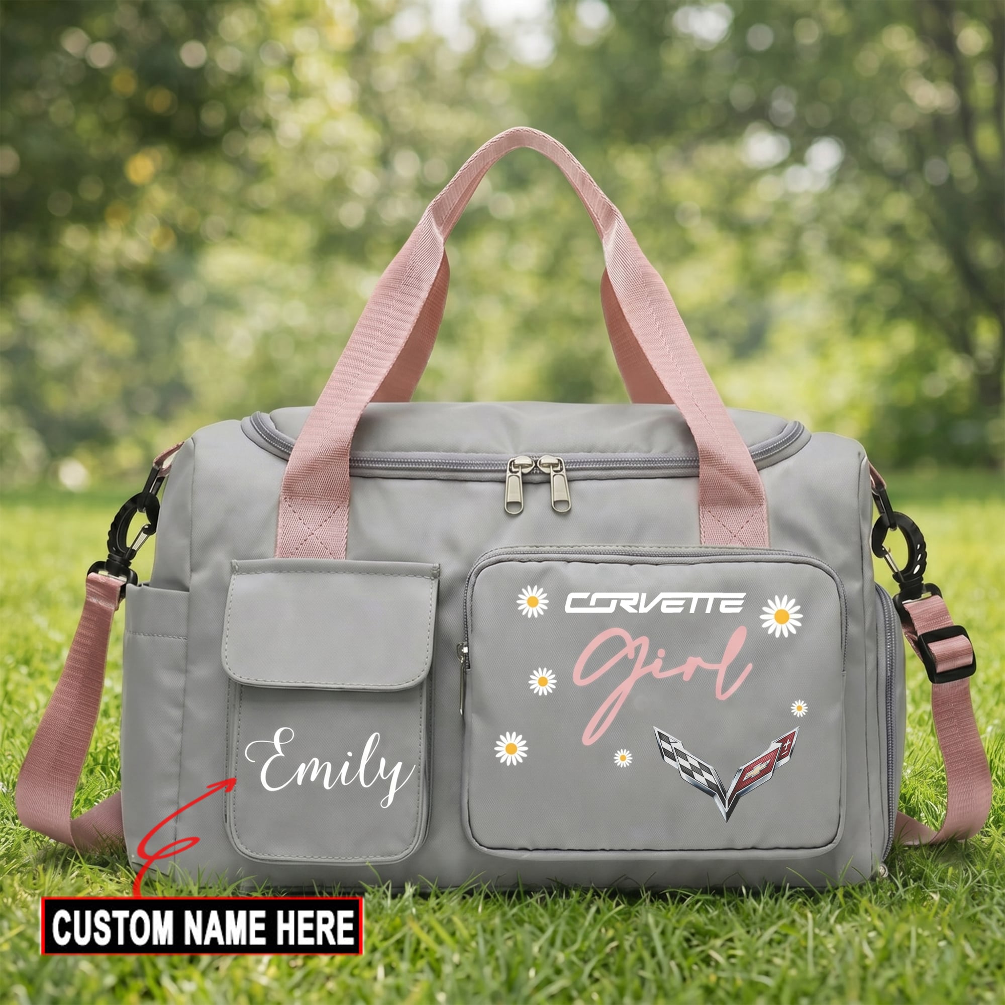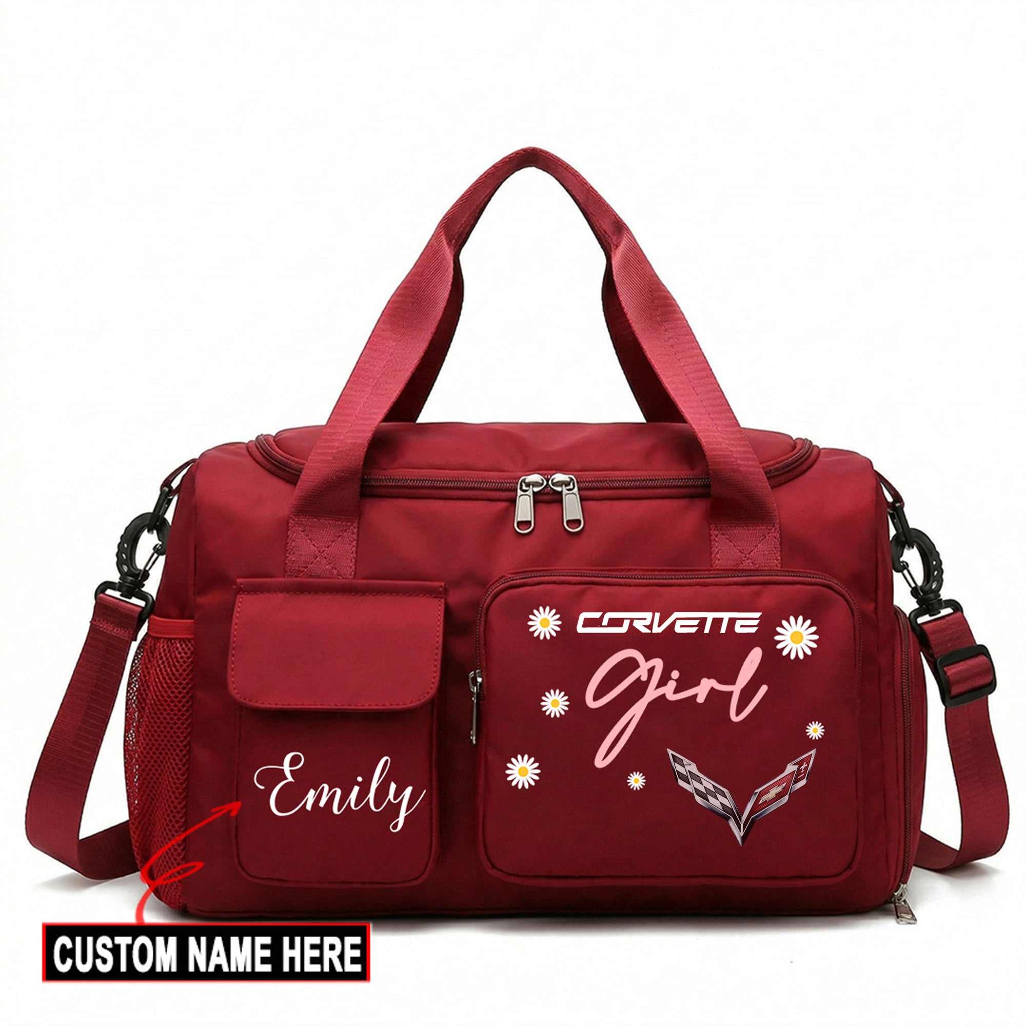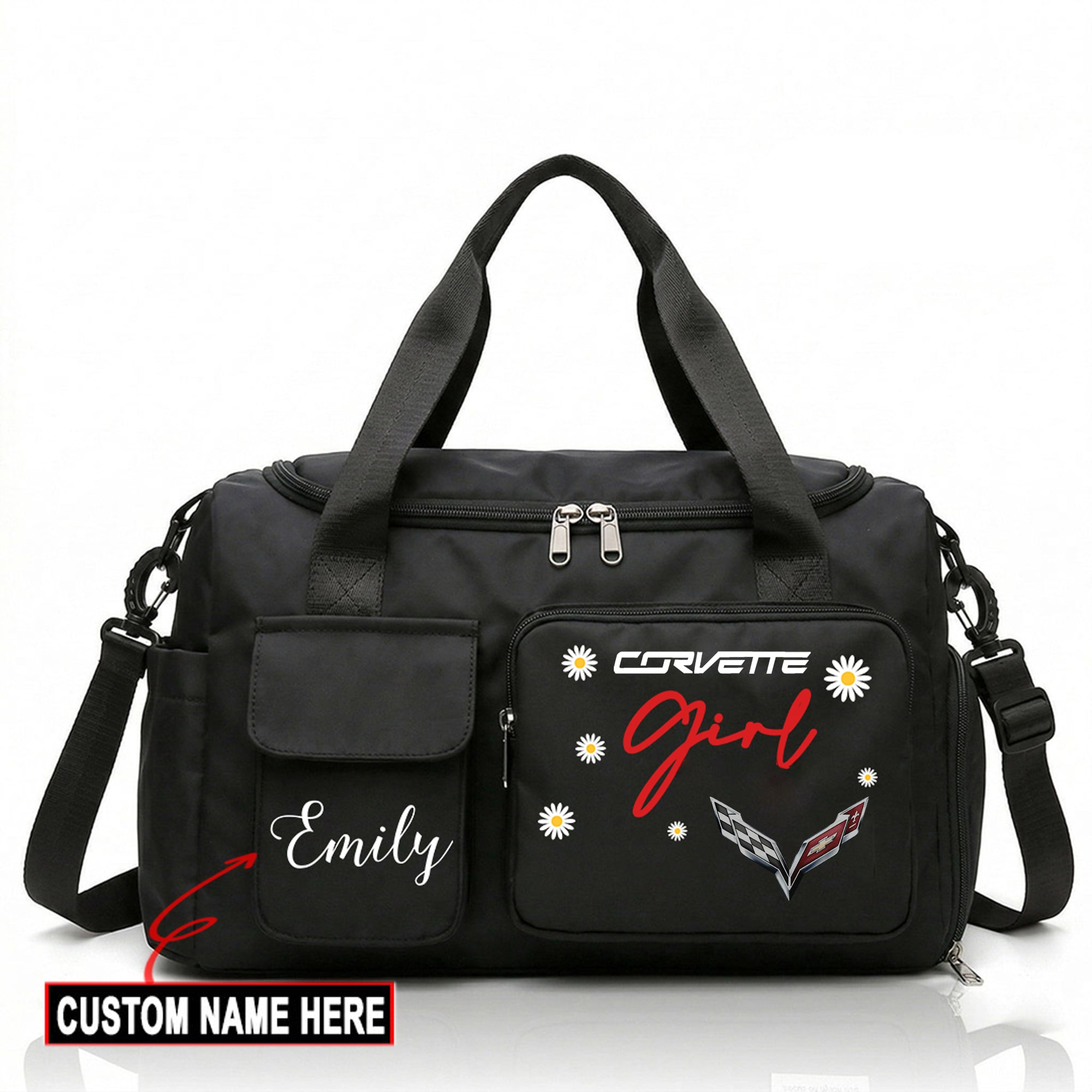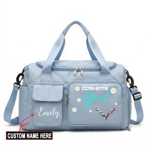 Hi there!! Are you looking at our Corvette Travel Duffel Bag. These bags are unique, made with love with the shining Corvette emblem on it. The Corvette Emblem on the Travel Duffel Bag makes it a perfect item for any Corvette Lovers and Ladies
