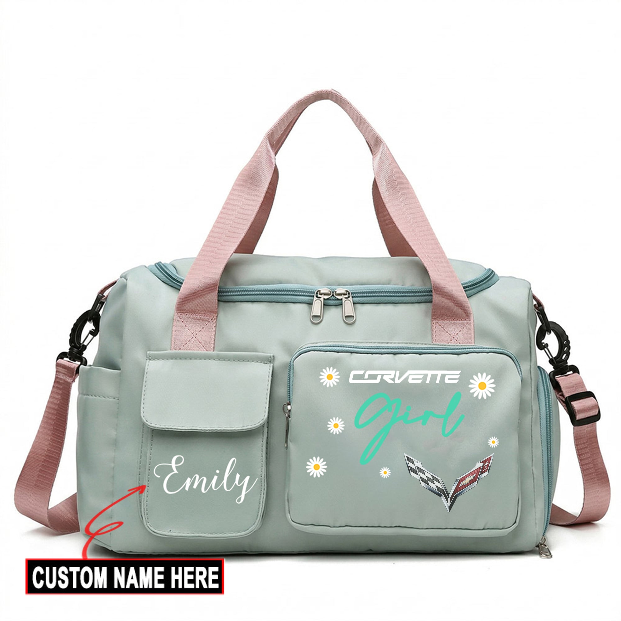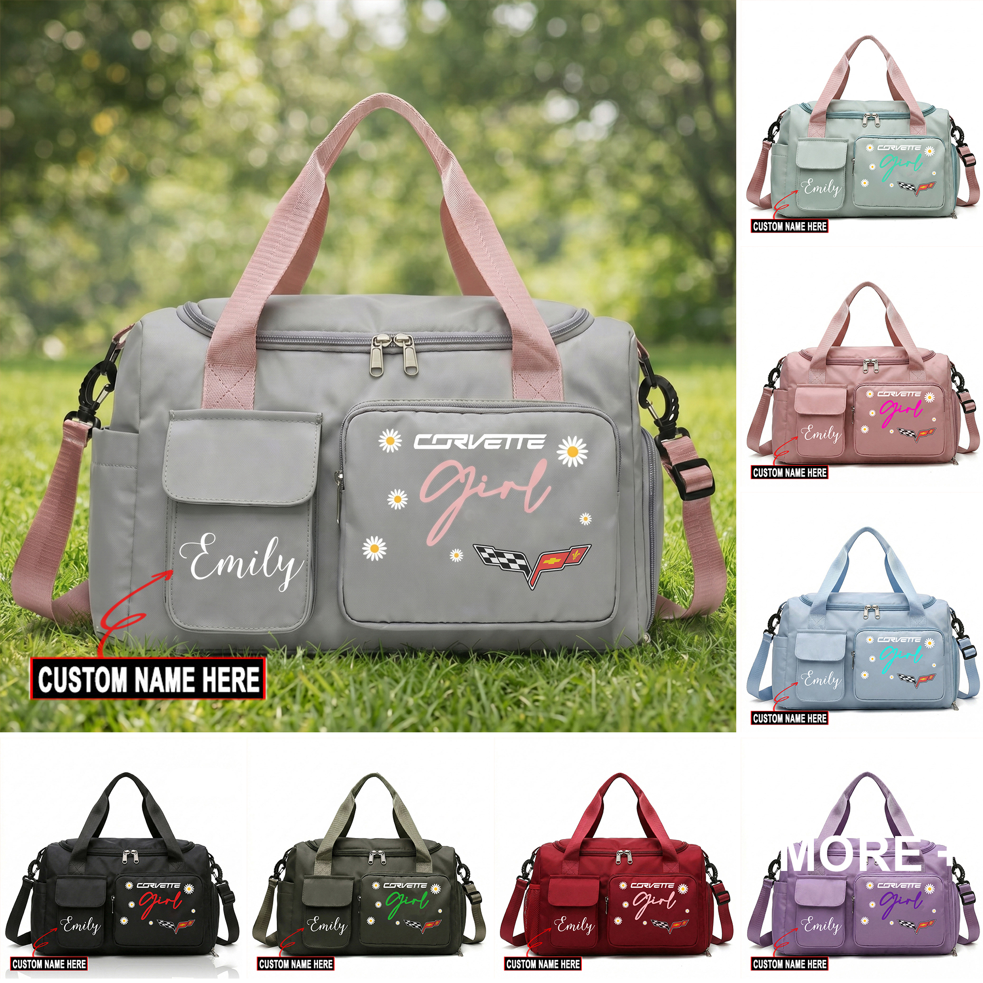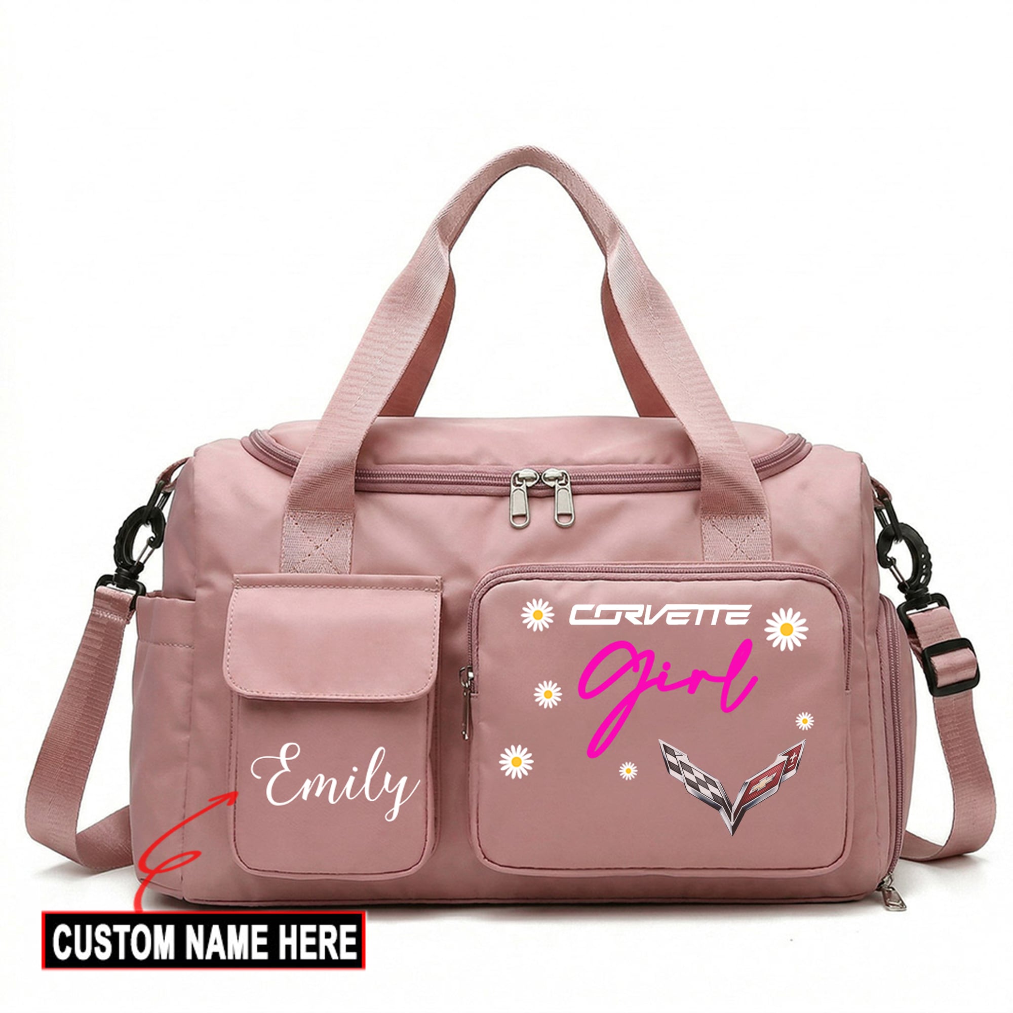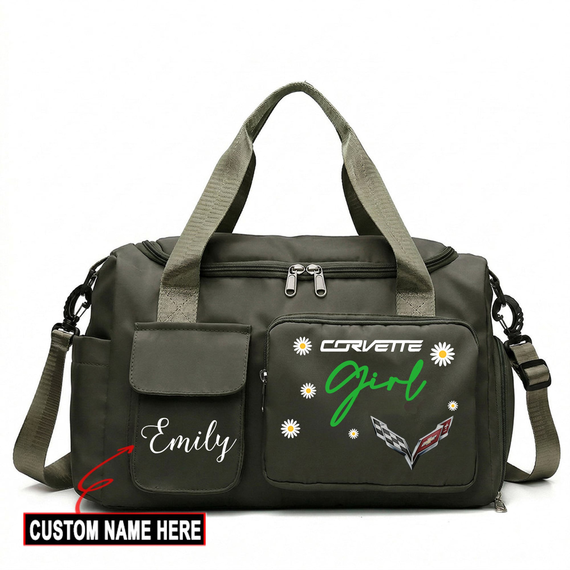 Hi there!! Are you looking at our Corvette Travel Duffel Bag. These bags are unique, made with love with the shining Corvette emblem on it. The Corvette Emblem on the Travel Duffel Bag makes it a perfect item for any Corvette Lovers and Ladies