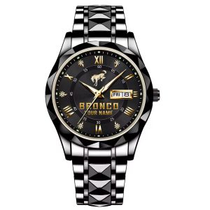 With the launch of the exclusive Made-to-Order service, you can make your watch unique by not only having your special Ford Bronco Emblem but also your Name printed on the watch. Elevate your style with our custom watches featuring your favorite car logo. Meticulously crafted for durability and water resistance, these watches are the perfect item for daily use. Discover the ultimate combination of luxury, utility, and personalization!
