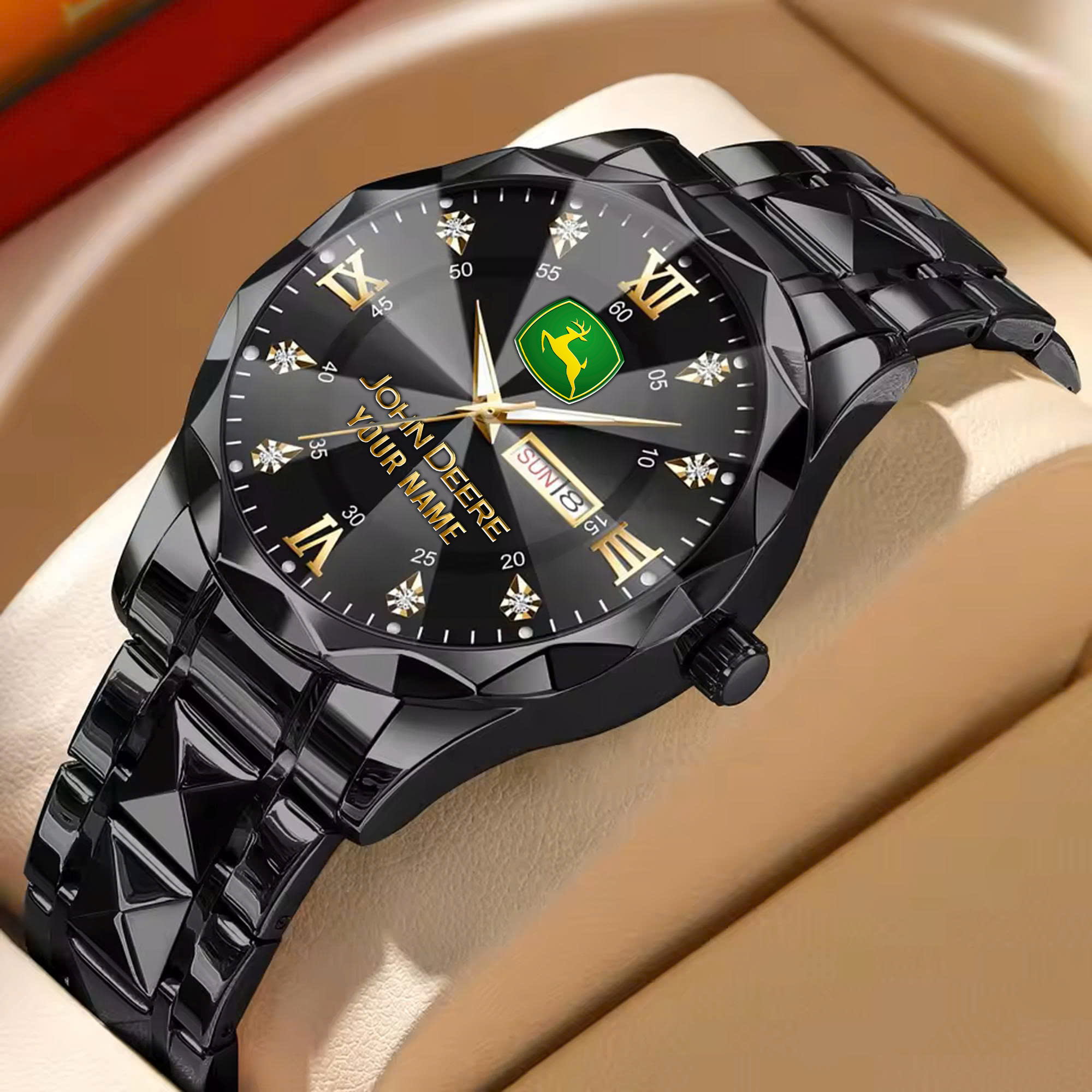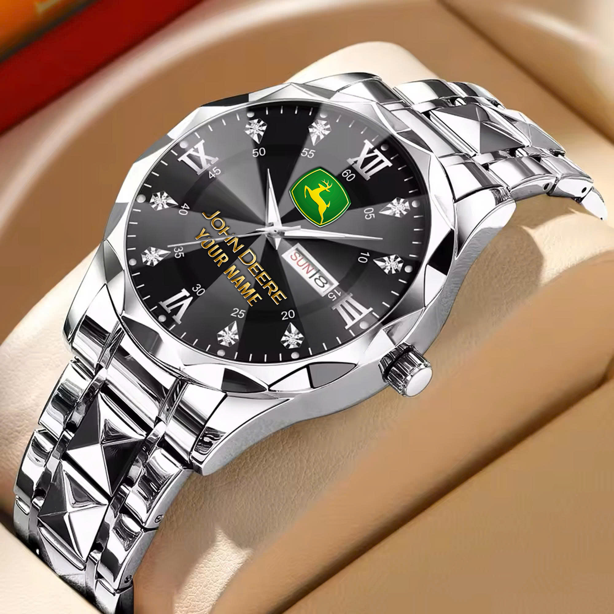 With the launch of the exclusive Made-to-Order service, you can make your watch unique by having your special John Deere Emblem printed on the watch. Elevate your style with our custom watches featuring your favorite car logo. Meticulously crafted for durability and water resistance, these watches are the perfect item for daily use. Discover the ultimate combination of luxury, utility, and personalization!