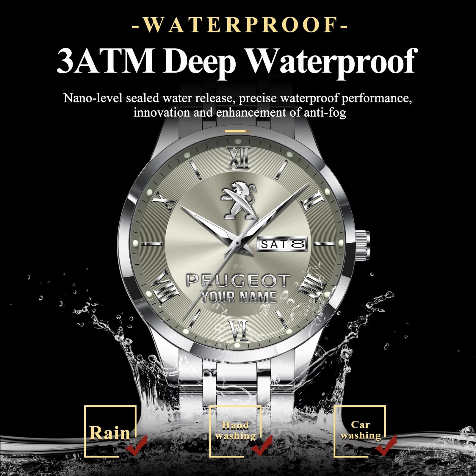 With the launch of the exclusive Made-to-Order service, you can make your watch unique by not only having your special Peugeot Emblem but also your Name printed on the watch. Elevate your style with our custom watches featuring your favorite car logo. Meticulously crafted for durability and water resistance, these watches are the perfect item for daily use. Discover the ultimate combination of luxury, utility, and personalization!