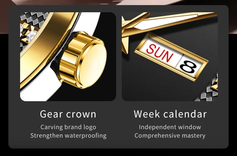 in low-light conditions. - Auto Date and Week Display: Built-in calendar and weekday display keep you organized throughout