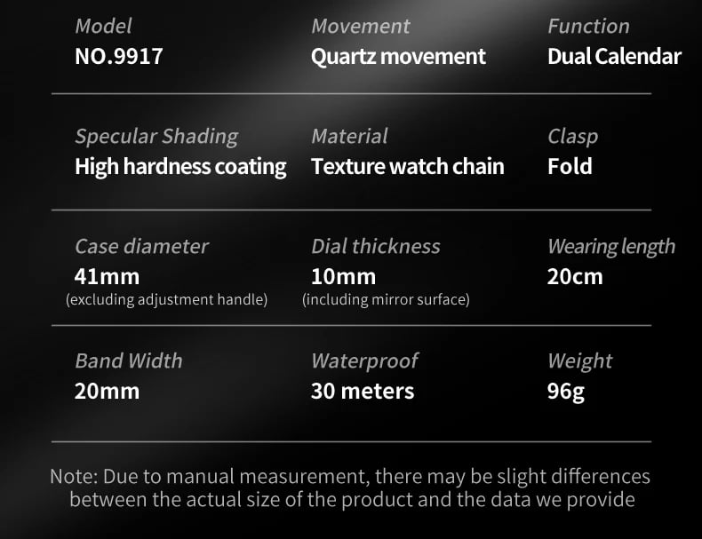 more stable performance. - 3ATM Water Resistance: Suitable for daily wear and resistant to splashes or rain. Not recommended