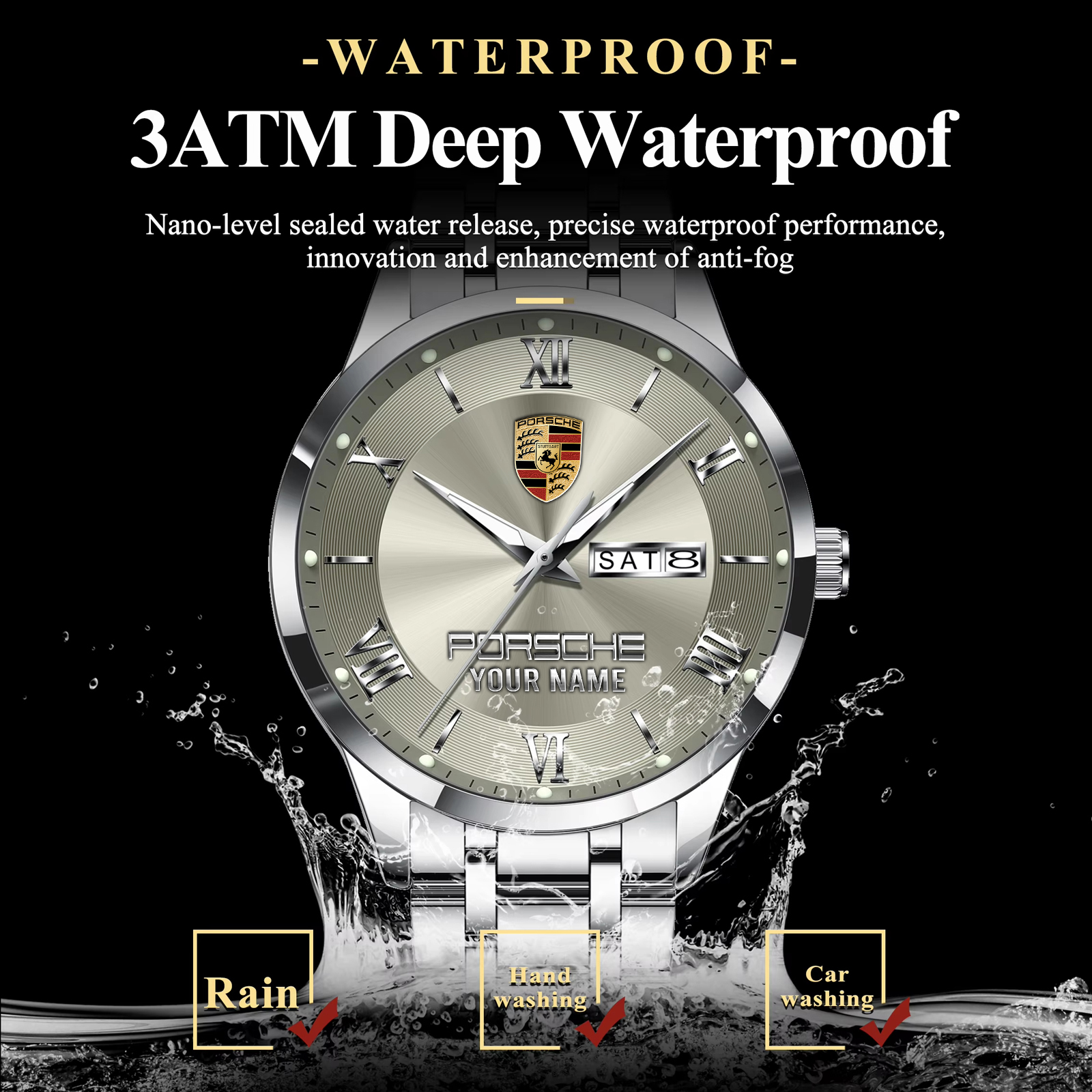 With the launch of the exclusive Made-to-Order service, you can make your watch unique by not only having your special Porsche Emblem but also your Name printed on the watch. Elevate your style with our custom watches featuring your favorite car logo. Meticulously crafted for durability and water resistance, these watches are the perfect item for daily use. Discover the ultimate combination of luxury, utility, and personalization!