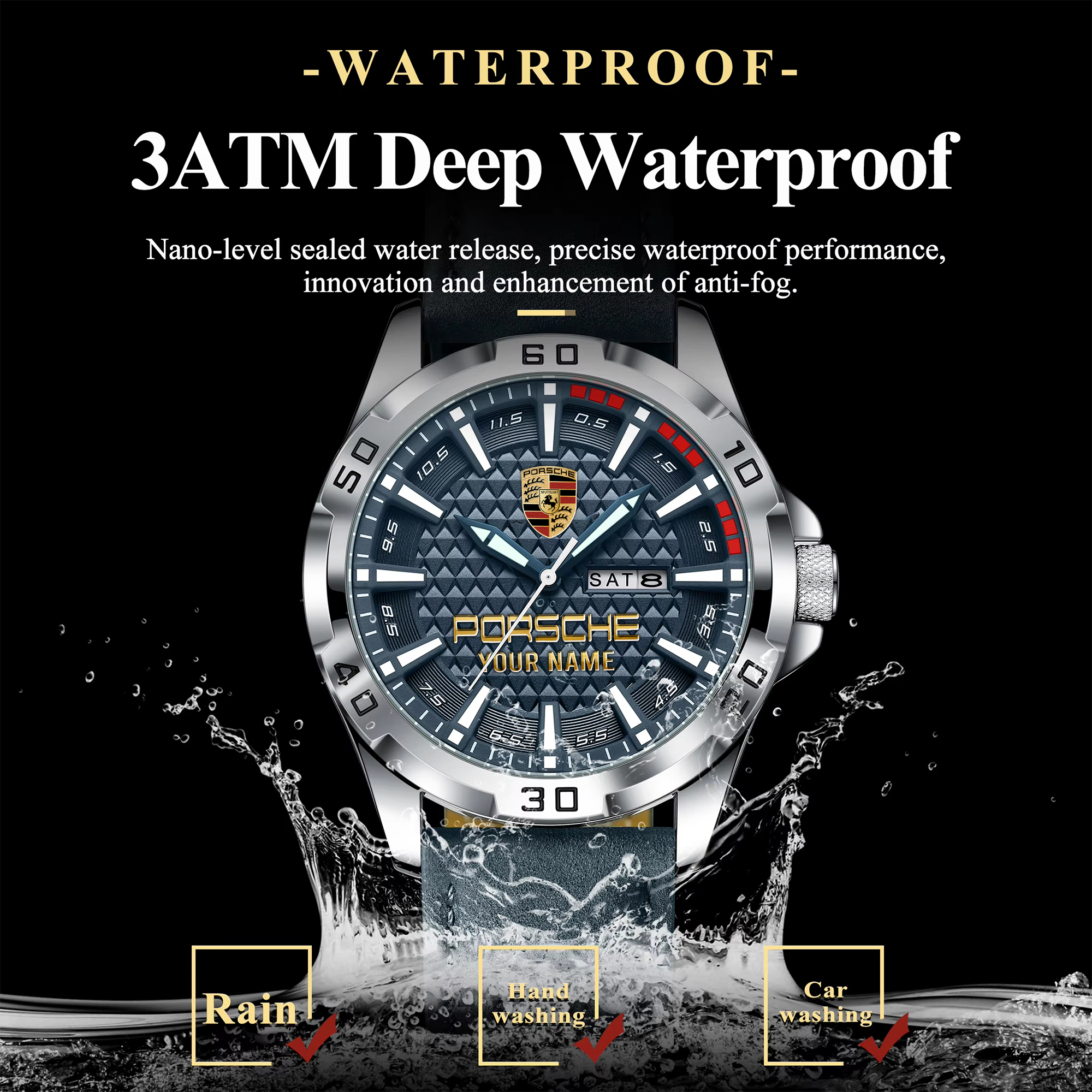 With the launch of the exclusive Made-to-Order service, you can make your watch unique by not only having your special Porsche Emblem but also your Name printed on the watch. Elevate your style with our custom watches featuring your favorite car logo. Meticulously crafted for durability and water resistance, these watches are the perfect item for daily use. Discover the ultimate combination of luxury, utility, and personalization!