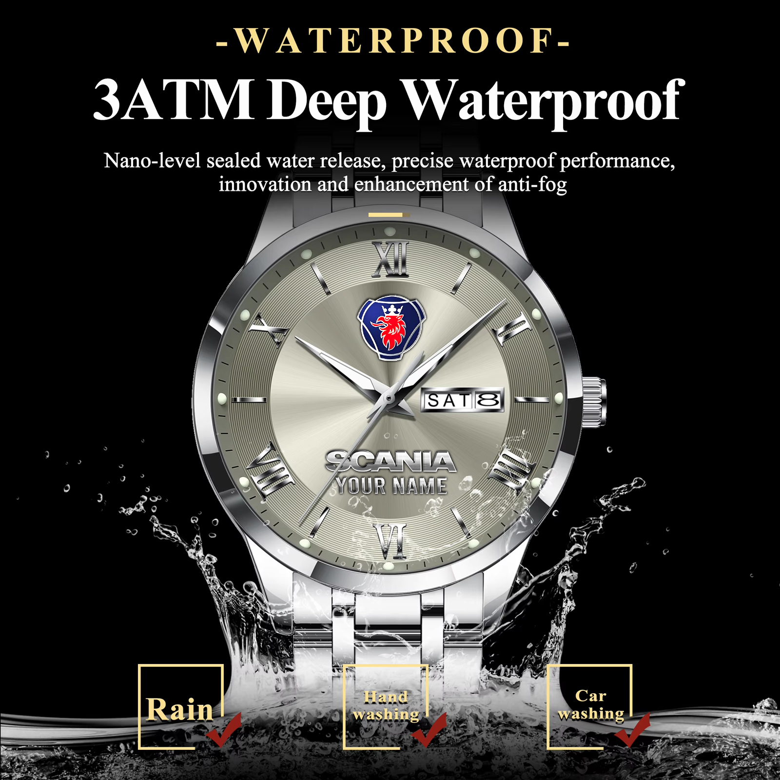 With the launch of the exclusive Made-to-Order service, you can make your watch unique by not only having your special Scania Emblem but also your Name printed on the watch. Elevate your style with our custom watches featuring your favorite car logo. Meticulously crafted for durability and water resistance, these watches are the perfect item for daily use. Discover the ultimate combination of luxury, utility, and personalization!