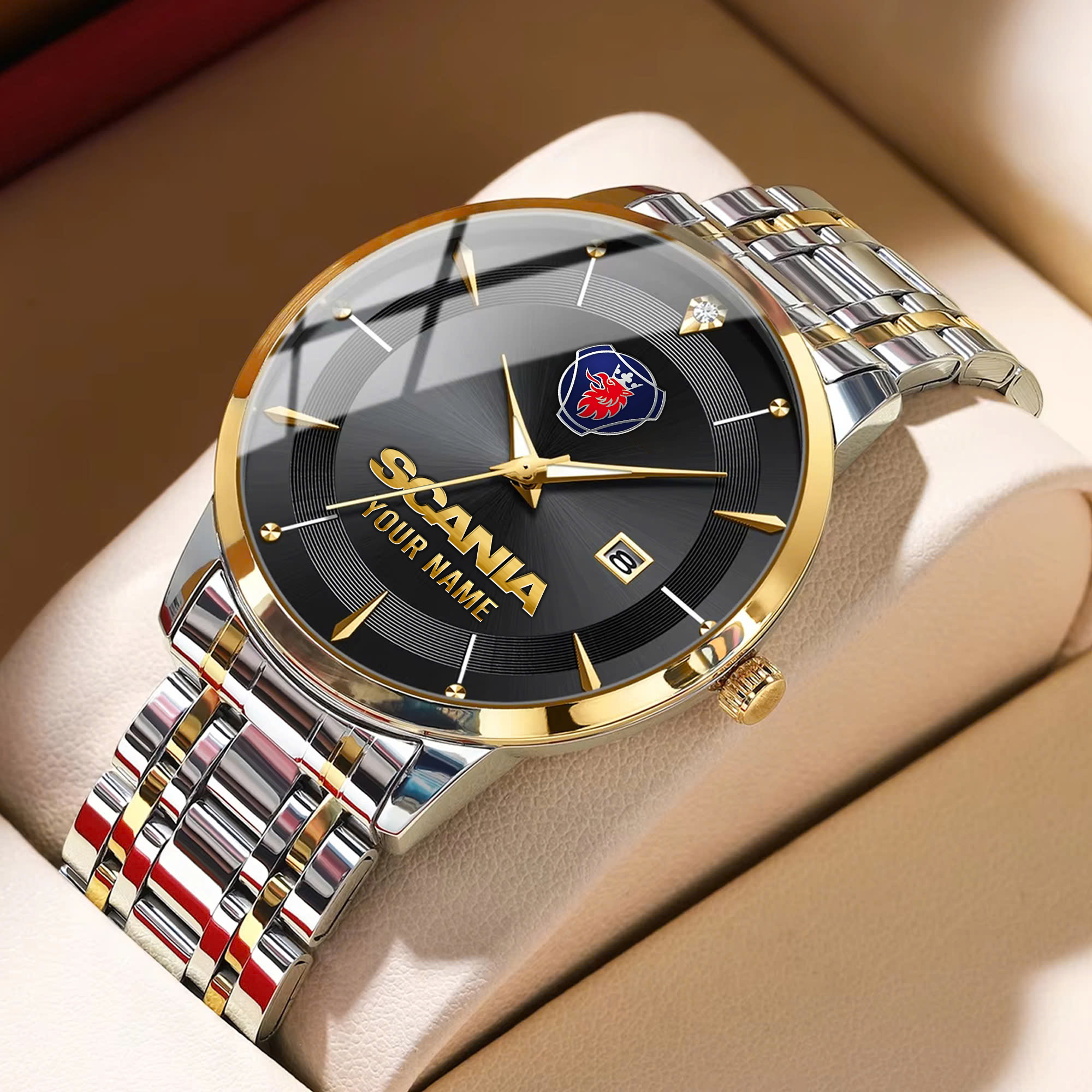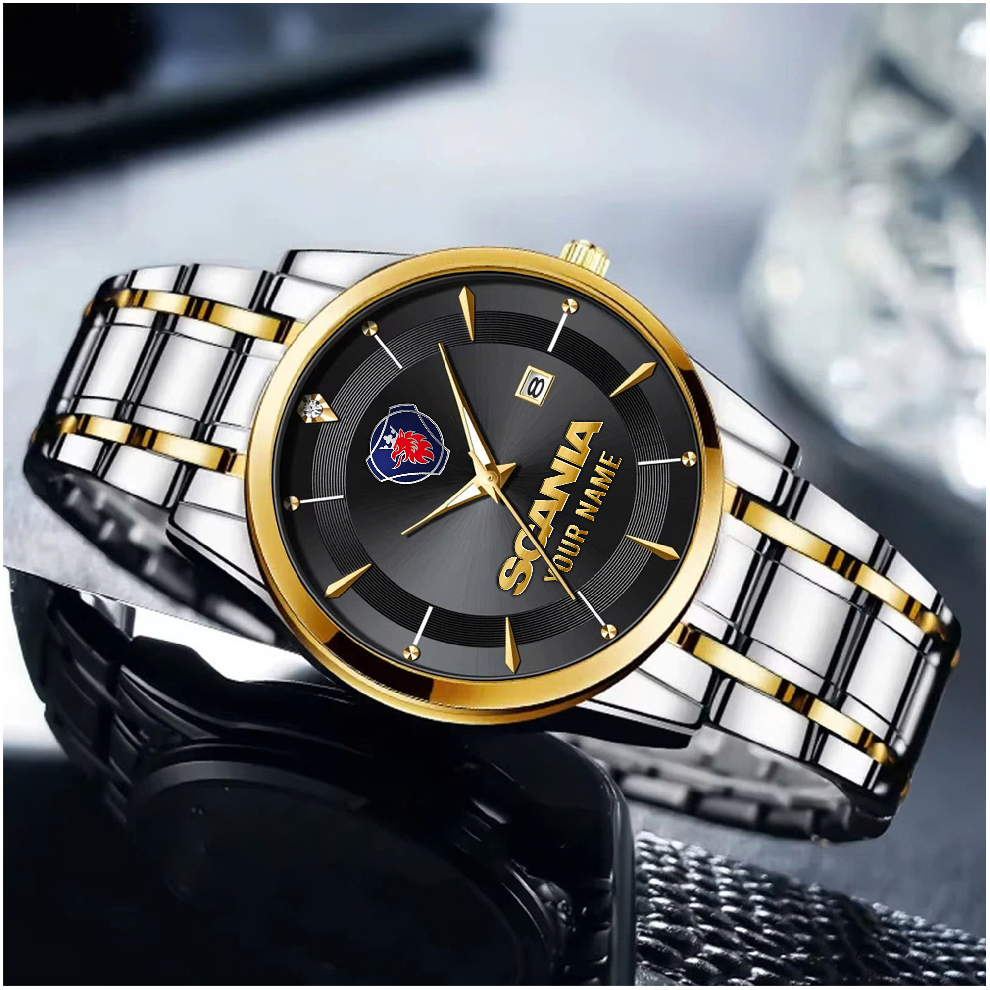 With the launch of the exclusive Made-to-Order service, you can make your watch unique by not only having your special Scania Emblem but also your Name printed on the watch. Elevate your style with our custom watches featuring your favorite car logo. Meticulously crafted for durability and water resistance, these watches are the perfect item for daily use. Discover the ultimate combination of luxury, utility, and personalization!