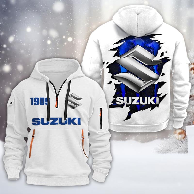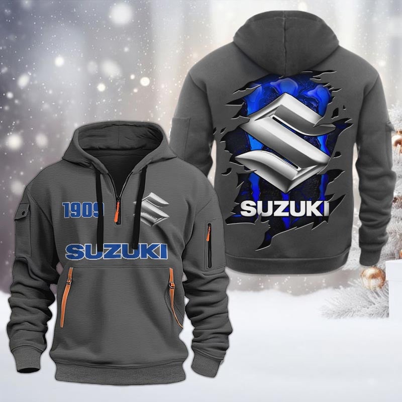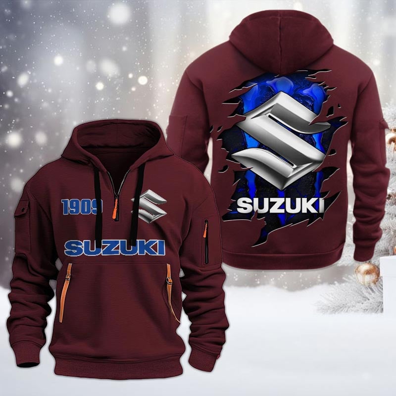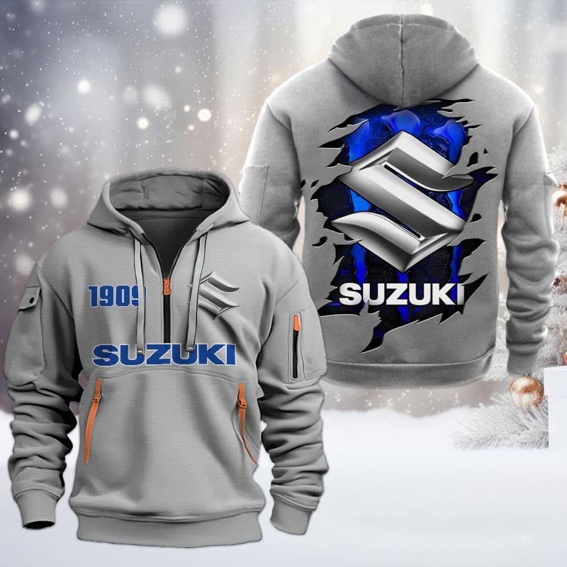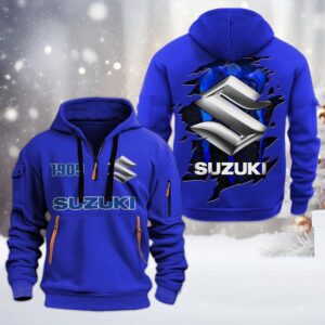 Hi there!! Are you looking at our Suzuki Half-zip Hoodie. These Half-zip Hoodies are unique, made with love, and they are perfect accessories for your outfit. The Suzuki Emblem on the Half-zip Hoodie makes it a perfect item for any Suzuki Lovers.